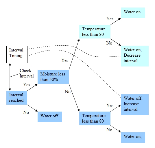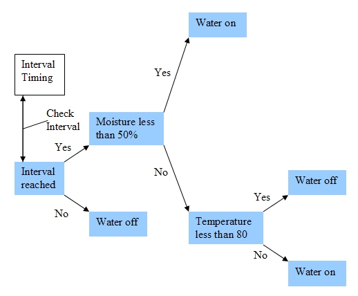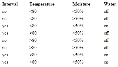 The program has three inputs, an interval timer, a thermometer, and a soil moisture detector. The program will check the interval timer each hour. If the interval timer is set to yes, the program will check the temperature and soil moisture. Depending on the conditions the program will or will not turn on the lawn sprinklers. The conditions are provided in the following table. [The interval timer is preset to 4 hours, no under this heading means the timer is not reached its next interval when checked, and yes means it has. < 80 means less than 80 degrees, >80 means greater than 80 degrees. off under the Water heading means the sprinklers are not turned on, and on means they are.]